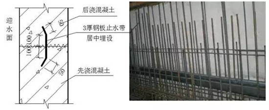 在支設結構模板時,把止水帶的中間夾于木模上,同時將木板釘在木模上,并把止水帶的翼邊用鋼絲固定在側模上,然后澆筑混凝土,待混凝土達到一定強度后,拆除端模,用鋼絲將止水帶另一翼邊固定在側模上,再澆筑另一側的混凝土。