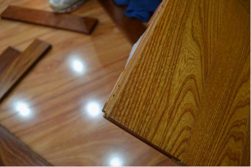 鋪設地板時,先把地板槽內均勻的抹膠,然后對準槽口安裝,最后再用榔頭敲擊方磚,使地板間的縫隙縮小。