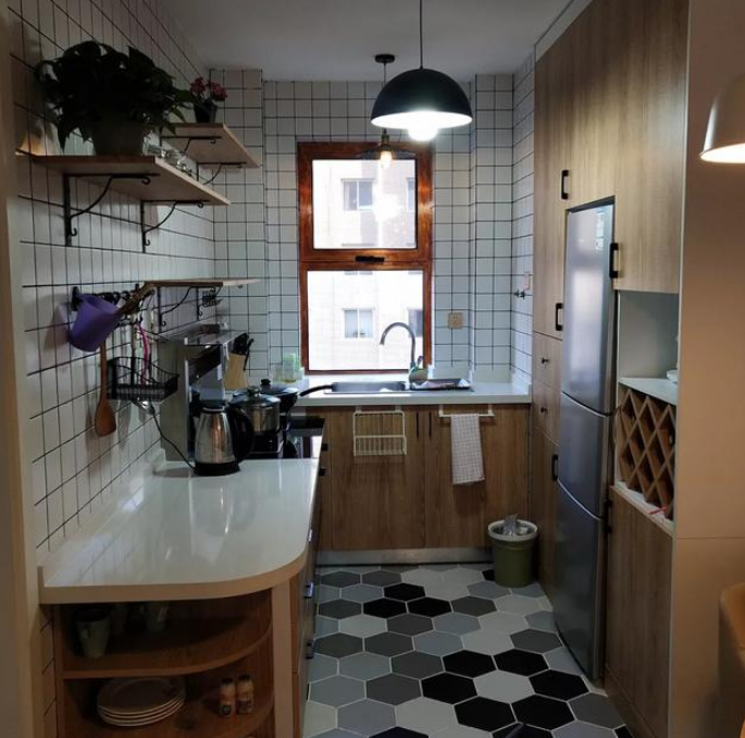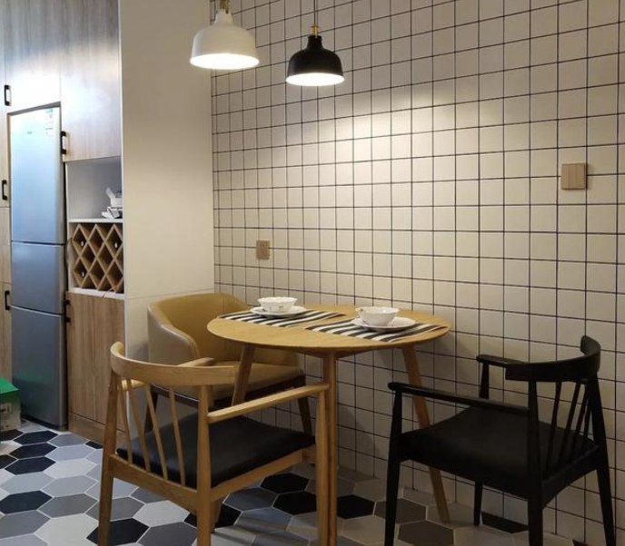 這是餐廳,空間比較小,布置了小圓形的餐桌,相對比大的那種圓形餐桌占用的位置要小,而且平時也足夠我們一家三口使用了。墻上和地面都是鋪瓷磚,非常耐臟。尤其是地面鋪的黑白灰的六邊形地磚,效果非常漂亮。