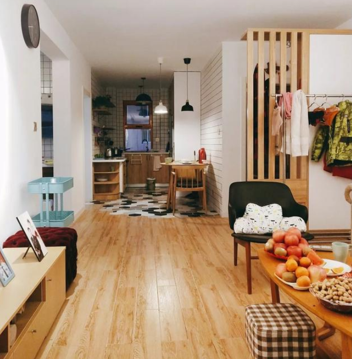 全屋都是不做吊頂,包括廚房和衛生間都沒有做吊頂。不做吊頂發現太明智了,而且樓層的高度顯得沒有那么壓抑,效果顯得也比較大氣。地面鋪的木地板是原木色,包括家具都是原木色,顯得比較統一,超喜歡了。