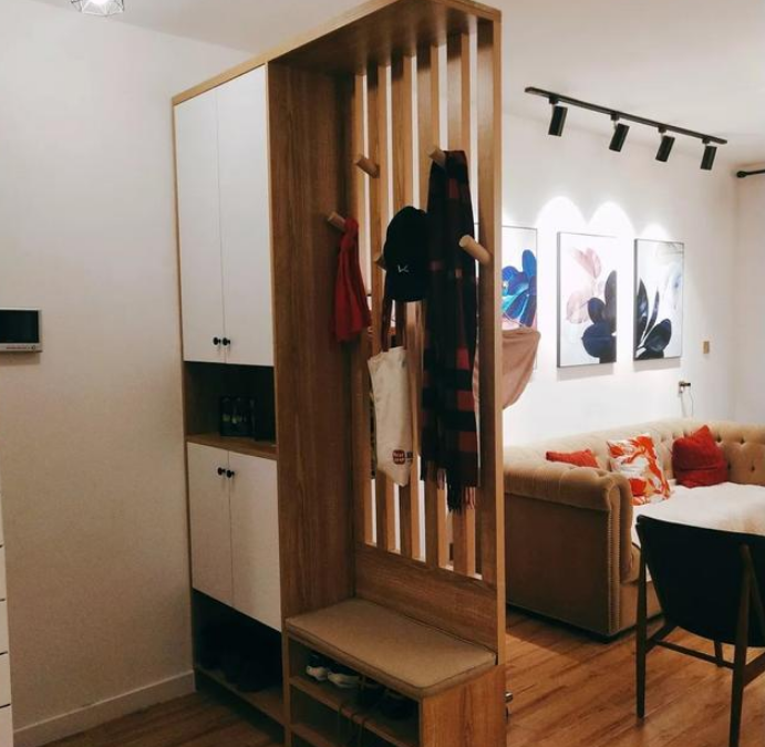 這是入戶玄關,玄關柜是我們參考網上的,然后自己做了稍微做修改,最后拿著圖紙在外面店里定制。玄關鞋柜分為上下兩層,中間留空位置可以方便放鑰匙。鞋柜下面留空位置,可以放我們平時常穿的鞋子,非常方便使用,很多朋友一進門都羨慕了我們家這樣的玄關鞋柜。入戶大門直接正對著客廳,考慮到這點,玄關鞋柜一邊做了鏤空,可以透過看到客廳里邊的空間,比較有空間感哈。