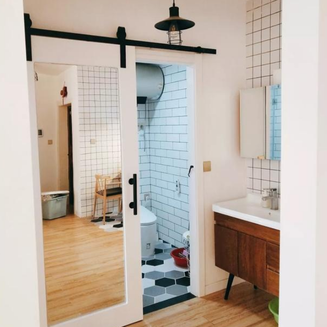 這是衛生間,安裝了倉谷門,門上貼了一面鏡子,當做浴室鏡子使用,平時可以對著鏡子整理自己衣衫。衛生間地面鋪的瓷磚也是貼了六邊形的黑白灰瓷磚,效果也非常漂亮。