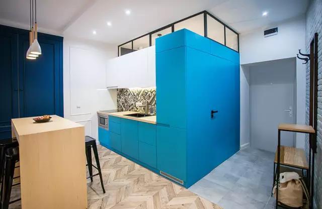 開(kāi)放式的廚房設(shè)計(jì)是小戶型的首選,加入花磚和藍(lán)色、白色的柜門(mén)設(shè)計(jì),有了燈光搭配便很好看。
