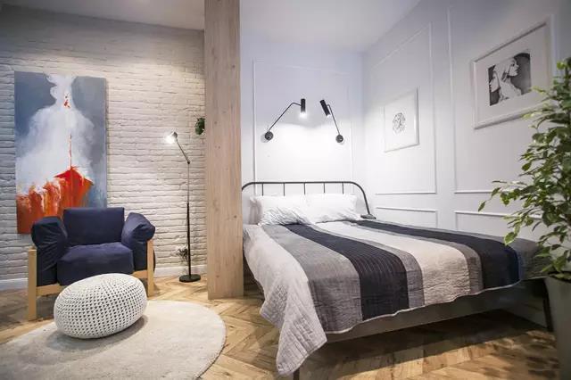 書(shū)架和不一樣的墻面設(shè)計(jì),都把臥室和客廳在空間做了劃分。