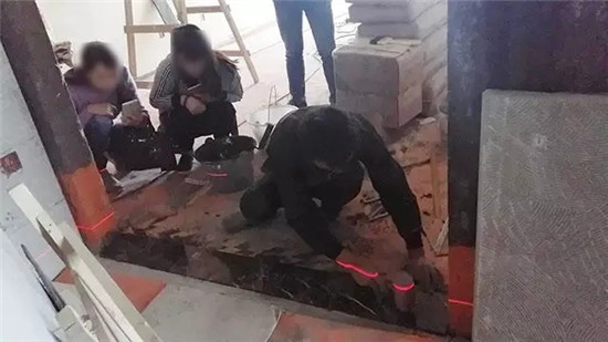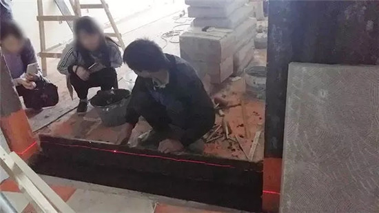 接下來師傅就用卷尺和水平儀測量門檻石鋪貼的平整度,保證門檻石的兩邊、中間的高度一致。
