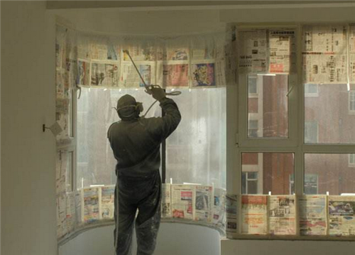 我們需要做大量的準備工作:在門上和窗戶上鋪上報紙;地面上蓋好保護膜。等乳膠漆噴完后,我們就可以將遮擋物揭除。這樣做既可以防止門窗、地板受到乳膠漆的污染,也大大方便后期保潔工作的順利進行。