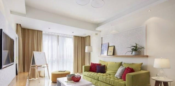 綠色的沙發帶來一抹清新之感,沙發上方一塊擱板,擺上綠植和裝飾畫,十分美觀。