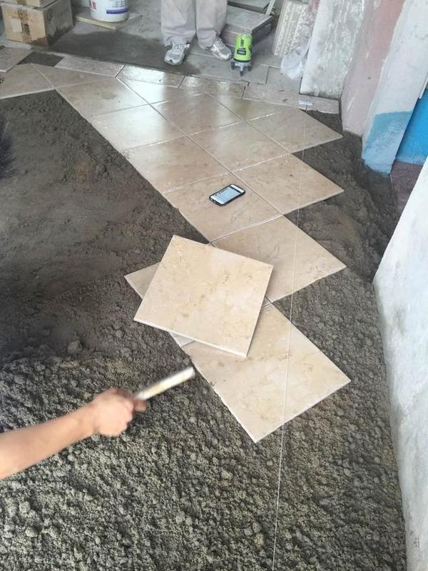 所謂的干鋪法就是先把地面基層處理干凈,澆水讓地面充分濕潤,接著用專門的干性水泥進行1:3的水泥砂漿配比,先把瓷磚放在砂漿上用橡皮錘錘實,然后再把瓷磚翻過來抹上水泥砂漿,再根據均勻的間隙鋪上磚。