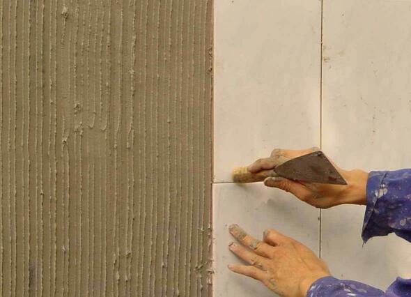 在涂抹瓷磚膠的時候選擇齒型刮板,這樣可以使得均勻分布,并形成一條條齒狀。每次涂布約1平方米左右,然后在晾置時間內將瓷磚揉壓于墻面;選擇齒型刮板的大小應考慮工作面的平整度和瓷磚背面的凹凸程度以及瓷磚的大小(即平整度越差或磚越大時應選用的齒型刮板的齒深越大);瓷磚較大時,應在工作面和瓷磚背面雙面涂膠,并形成一條條齒狀,再將瓷磚在晾置時間內揉壓至墻面。