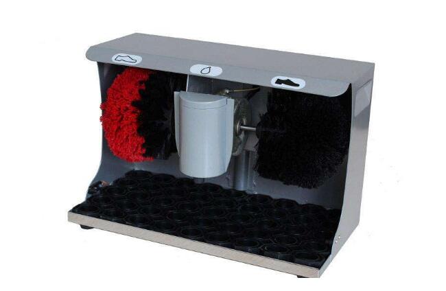 (3)力潔擦鞋機,自動擦鞋機的兩側面安有紅外感應線,將腳伸出便能夠進行工作,便可以進行擦拭。在它的扶手位置是手動的開關裝置,打開便可以運行,清洗鞋子的表面灰塵,鞋子的后跟部位也可以擦得干干凈凈。