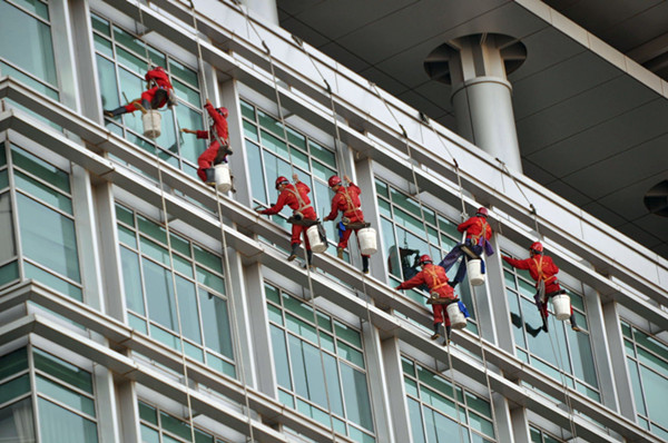 2、吊籃方式:在樓頂架設(shè)吊籃將工人運(yùn)送到指定位置進(jìn)行施工操作。此施工方式清洗效率較低,成本較高。