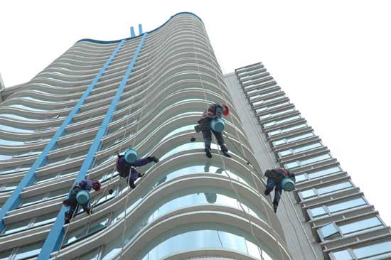 外墻玻璃是建筑物外墻面采用較多的材料之一。建筑物外墻可選用的玻璃品種眾多,大多又與其他材料組合成外墻面,故除了針對(duì)上部層面和底層采用不同的清潔工藝外,對(duì)清潔劑的選擇還應(yīng)有一定的研究。