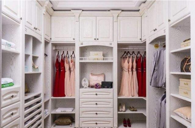 歐式衣帽間的面積應在4㎡以上,要保證給主人充裕活動的空間。衣帽間內部還需再根據衣物的品類分區,一般分掛放區、疊放區、內衣區、鞋襪區和被褥區。