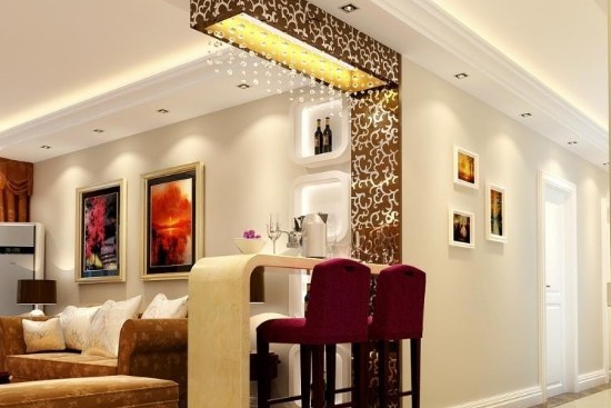 利用吧柜、吧臺對空間實行分隔,適用于面積較大且要求有多種功能區(qū)域的室內。