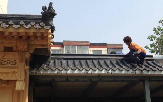 仿古瓦在安裝時一般是采用濕漿鋪貼,這樣才能保證板瓦、垌瓦與屋面的粘合面更加牢固。一般在屋面坡度45以下,需要將檐口到屋脊距離5米以內檐口的滴水、勾頭用銅線捆牢。而5米以上的屋面可在瓦面的中部適當用銅線捆牢部份底瓦及垌瓦,垌瓦在安裝時2至3米長度以及脊瓦每隔5至10米須預留一條5至8mm寬膨脹縫,以防受熱膨脹而擠壓損壞。