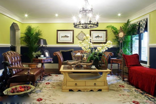 1、客廳:美式鄉(xiāng)村風(fēng)格的客廳歷史氣息濃厚,并且寬敞大氣。裝飾材料以石材和木材為主,擺件則以富含美式文化的藝術(shù)品為主,布局簡(jiǎn)單,空間層次感強(qiáng),色彩明亮。