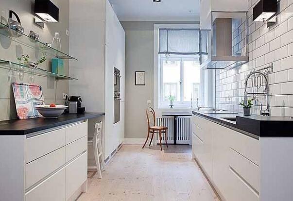 (3)小戶型北歐廚房,小戶型北歐廚房由于空間極小,以墻上隔板和掛鉤的設計代替櫥柜,達到整齊收納廚具和日常廚房用品的目的,以保持廚房的整潔干凈。
