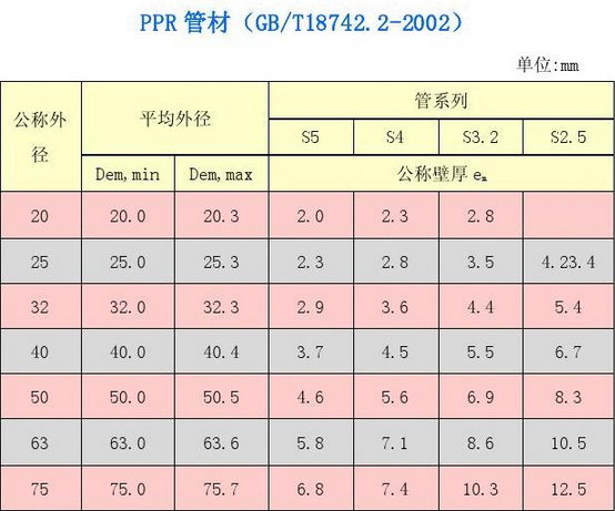 PPR管材規格用管系列S、公稱外徑dn×公稱壁厚en表示 例:PPR管系列S5、PPR公稱直徑dn25mm、PPR公稱壁厚en2.5mm 表示為S5、dn25×en2.5mm PPR管系列S:是用以表示ppr管材規格的無量綱數值系列,有如下關系S=(dn-en)/ 2 en 其中:dn——PPR公稱外徑,單位為mm en——PPR公稱壁厚,單位為mm 一般常用的PP-R管規格有5、4、3.2、2.5、2五個系列 PPR管規格PPR管材按標準尺寸率SDR值分為11、9、7.4、6、5五個系列。 PPR管規格PPR標準尺寸率SDR:為PPR管材公稱外徑dn與公稱壁厚en的比值。 PPR管規格SDR與PPR管系列的關系如下:SDR=2S+1 PPR管件規格的表示方法: PPR管件公稱外徑dn 指與PPR管件相連的PPR管材的公稱外徑。PPR管件的壁厚應不小于相同PPR管系列S的PPR管材的壁厚。 大部分企業PPR管件都只有最高標準S2一個系列,冷熱水全部試用 PPR管規格S5系列--------------1.25兆帕(12.5公斤) PPR管規格S4系列--------------1.6兆帕(16公斤) PPR管規格S3.2系列------------2.0兆帕(20公斤) PPR管規格S2系列--------------2.5兆帕(25公斤)