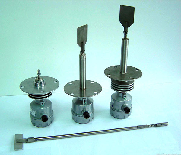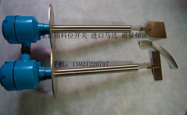 采用交流微電機(jī)經(jīng)減速后,帶動監(jiān)測葉片慢速旋轉(zhuǎn),當(dāng)物料的料位上升使葉片的轉(zhuǎn)動受到阻擋時,檢測機(jī)構(gòu)便圍繞主軸產(chǎn)生旋轉(zhuǎn)位移。此位移首先使一個微動開關(guān)動作,發(fā)出有料的信號。隨后另一個微動開關(guān)動作,切斷微電機(jī)的電源使其停止轉(zhuǎn)動。只要倉內(nèi)的料位不變,此種狀態(tài)便將一直保持下去。
