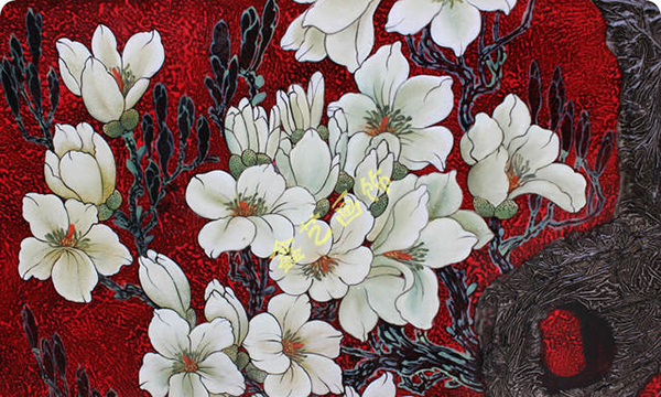 ②罩明,即用透明的漆罩于不同的漆地上,因底漆色相不同,又有“罩黃”、“罩朱”等。此法光明瑩徹,若在銀下變涂肌理,經細心打磨,可顯現豐富多彩的效果,這也是漆畫主要的技法語言。