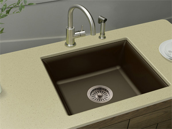 石英石和人造結晶的水槽也非常時髦,它們都是人工復合材料的一種,是由80%的純正花崗巖粉與20%的烯酸經過高溫加工后成型的。它圖案豐富,選擇性大,耐腐蝕,可塑性強,具有一定的吸音功能,轉角處沒有接縫,表面也比較光潔,與不銹鋼水槽的金屬質感相比,它更加溫和,而且亞克力有豐富的顏色可供選擇,有別于傳統的色調,布色均勻,用色夸張大膽,可以說獨具個性,它質樸、原色的另一面也為某些崇尚自然風格的家庭所喜愛。