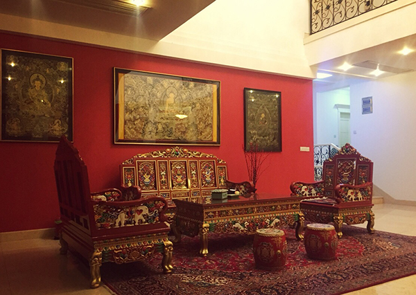 藏民族室內(nèi)家具主要有藏柜和藏桌。藏柜有放書的"比崗",高約1.1米,上方玻璃對開門。一般放置在坐墊的一角。"洽崗"(意為雙柜),必須成對,略高于"比崗",與擺設(shè)在屋內(nèi)正面沿墻,上面擺放佛龕。