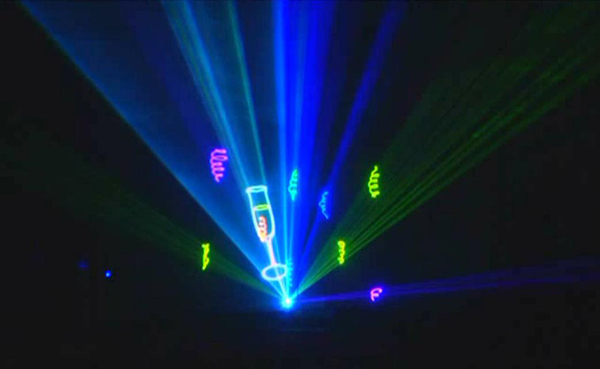 采用YAG固體激光器,使用氪燈及Nd:YAG晶體棒產(chǎn)生激光束,通過變頻,形成可見的綠色光。利用計算機控制振鏡發(fā)生高速偏轉(zhuǎn),從而形成漂亮的文字或圖形。控制軟件有德國的火鳳凰軟件、美國的穿山甲軟件等。