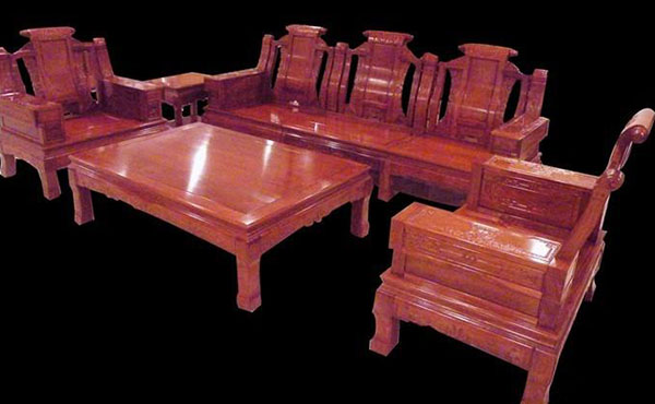 紫檀來自印度、菲律賓,是家具制作中最重要的一種木料。紫檀木料一般為深棕色,質密麗堅,表面溫和如玉,經磨洗成為紅灰色,浸油后則變為深紫色。我國處理紫檀有一種方法,即使用一種馬草研磨的橙色粉,磨擦使之滲入木料孔隙中,再涂一層漆,這種方法處理的材料稱為“金絲紫檀”,是最貴重的一種木料。