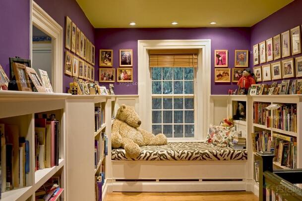 有些家庭會將飄窗和書柜合為一體,將飄窗布置成一個適合看書的舒適場所,讓兒童坐在飄窗上抬手就能拿到自己想看的書籍。另外,飄窗采光好,適合小孩子看書。