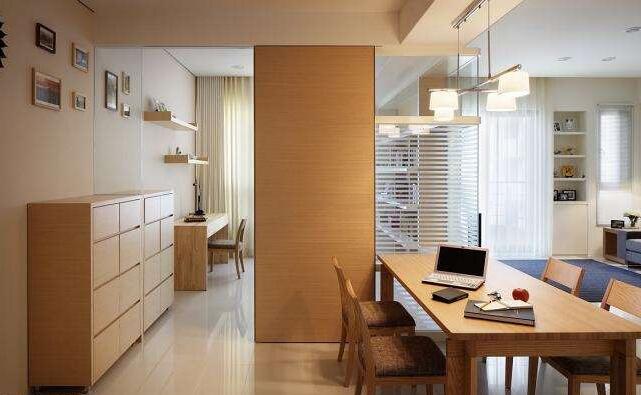 書房餐廳的隔斷可以分為很多類型,例如:滑動的,固定的,固定的又可分為透明的和不透明的。滑動的靈活性比較好,使得書房和餐廳相互連接又具有相對的獨立性,可以靈活變身,能夠為室內增添活力,同時避免了傳統墻體材料的厚重,影響采光和視覺等問題。