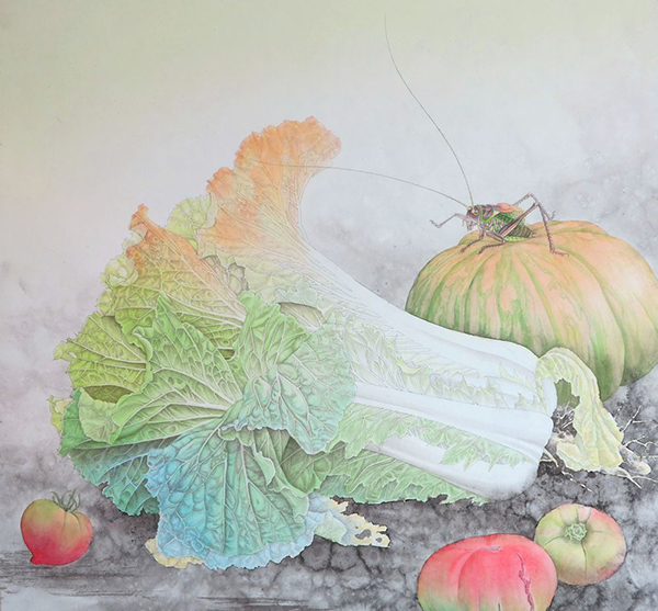 背景,最后用一寸底紋筆蘸淡草綠整體審視畫面后局部的調整關系。