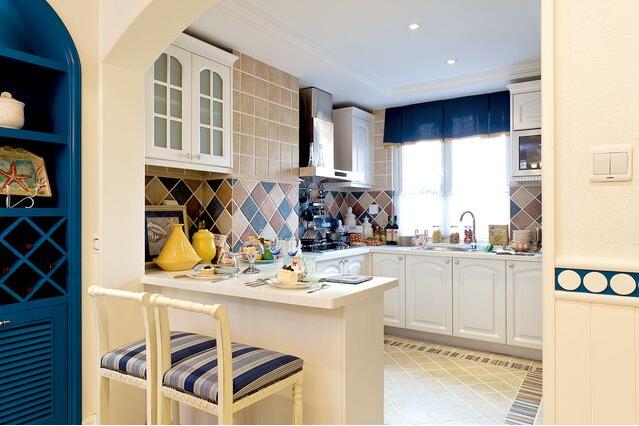 (2)其次,是對于地中海風(fēng)格廚房吊頂?shù)臒麸椷x擇。這樣要考慮到廚房的性質(zhì),最好不要采用花式的吊頂,這樣會顯得累贅突兀,容易沾上油煙,后期還不好清洗。根據(jù)地中海質(zhì)樸的特點(diǎn),要選擇簡單、照明效果好的燈具。最好是選擇內(nèi)嵌式的壁燈,這樣會顯得廚房的空間更大,更簡潔。