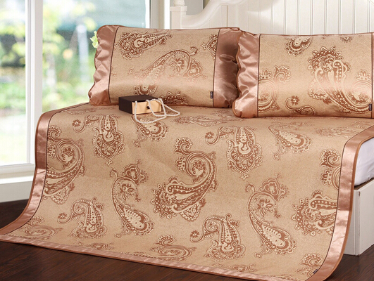 冰絲的含濕率適合人體皮膚的生理要求,具有光滑涼爽、透氣、抗靜電、色彩絢麗等特點。冰絲涼席產品具有清涼滑爽、透氣性強、質地牢固等特性,并且該款涼席可以折疊放置,方便收納,大大節約了收納空間。 經切、捻、經、織等現代的工藝處理,增強產品舒適感、涼感、光滑感、耐磨等特性。正面包芯植物藤緯(亞草或藤),經過防水處理,便于保養收藏。
