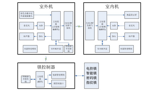 ??? 1、無(wú)線信號(hào)接收器接收來(lái)自室外機(jī)的無(wú)線語(yǔ)音或視頻信號(hào),主處理器對(duì)接收的信號(hào)進(jìn)行冗錯(cuò)和解碼等處理,然后將解碼的視頻信號(hào)通過(guò)顯示屏顯示出來(lái),而解碼的語(yǔ)音信號(hào)經(jīng)D/A轉(zhuǎn)換為模擬信號(hào),通過(guò)揚(yáng)聲器播放出來(lái)而且必要時(shí)還會(huì)觸發(fā)無(wú)線報(bào)警器。