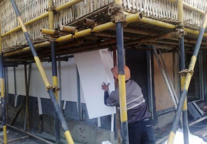 將苯板安裝子啊建筑物外墻上,粘貼時要注意苯板與苯板之間應拼嚴,縫寬超過2毫米時要用相應厚度的苯片填塞。