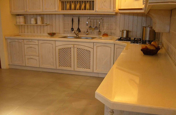 4. 石英石類:是一種全新的以天然石英結晶體礦為原料,由高達93%的石英結晶和7%的樹脂聚合物、礦物顏料、復合劑、添加劑在真空高溫及巨大壓力下合成的,其表面采用世界上最先進的工藝生產技術,經過了30多道極其復雜的拋光工藝制成的裝飾面材,其色調美觀、華貴、硬度高、集天然和人造石之優點于一身,具有刮不花、燙不壞、污不染、用不舊、無毒、無輻射等特點,比其它裝修面材應用在廚房及浴室上更勝一籌,是最理想的臺面裝飾材料。