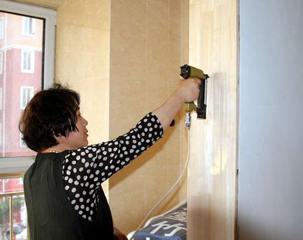 7.對(duì)門(mén)框裁口面和門(mén)扇的兩邊面貼微薄木后,如微薄木表面產(chǎn)生豆?fàn)钔古輹r(shí),可用針或小細(xì)回釘將鼓泡扎2-3個(gè)針眼,而后用食指按平壓實(shí)。