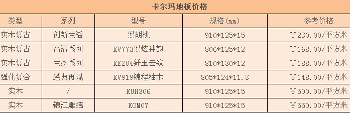 2009年卡爾瑪榮獲中國地板行業十大品牌榮譽稱號。卡爾瑪地板正在成為重大工程的首選品牌,北京潤楓水尚、北京輝煌國際、南京建鄴集團、中海地產等大型房產集團,在精裝修的樓盤中,卡爾瑪地板也成為了首選品牌。