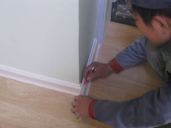 用卷尺、鉛筆等確定需要的踢腳線長度后,用鋸齒等工具進(jìn)行切割踢腳線材料。