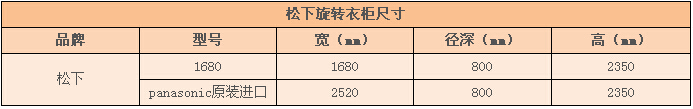 旋轉衣柜一般的尺寸都是按照其家居環境的大小來定制的,當然市場上也有制作好的尺寸。旋轉衣柜有迷你型、中型、大型等的不同規格,可以滿足不同空間長度。無論是新衣柜還是舊衣櫥的改造,安裝起來都極為方便。每隔型號、品牌的旋轉衣柜都是不一樣的,下面以松下旋轉衣柜為例: