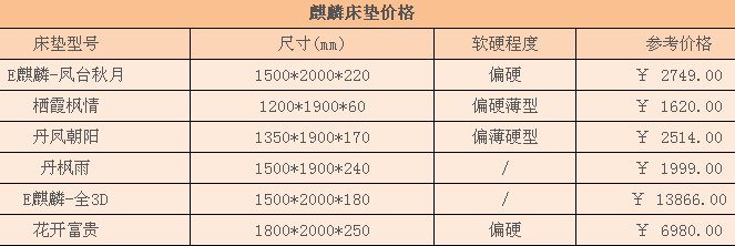麒麟床墊系列規格比較多,主要包括麒麟K系列、金榜麒麟型、椰棕AB型、麒麟之星型、電動床、袋王型、棕板王型等,外觀高貴大氣,質感軟硬適中,使用壽命長。