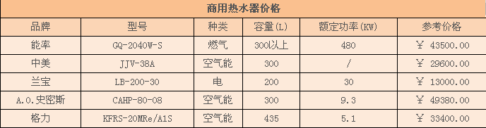 此外,商用熱水器品牌還有國內知名的燃氣熱水器品牌萬和和萬家樂、頂級的電熱水器品牌阿里斯頓、著名的空氣能熱水器品牌格力、美的以及大型家電廠商海爾等。
