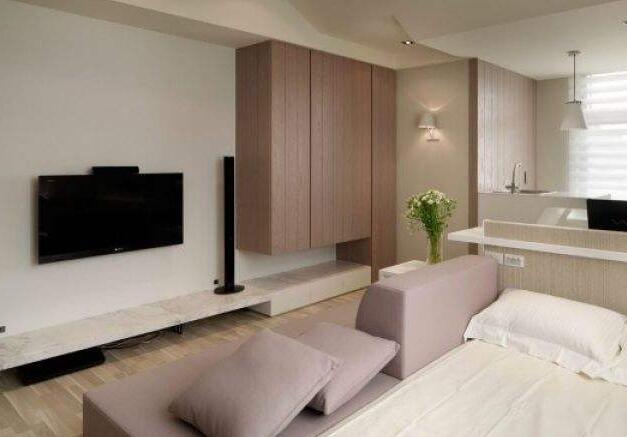 (2)功能:除了風格,功能也是客臥一體中不可忽略的一個部分。雖然做成了客臥一體,但是客廳和臥室的功能還是不同的。客廳主要是接待客人使用的,而臥室則是休息的地方,所以即使是客臥一體的設計,還是要將兩者做出區分。比較簡單的方法就是客廳使用冷色調的顏色,臥室使用暖色調的顏色。