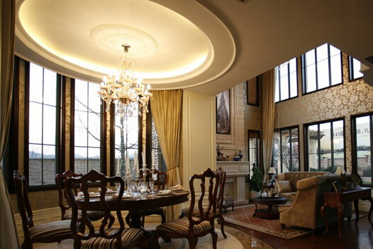 需要注意的是,圓形吊頂不是獨立的,它要與整體家居空間相互協調。一般而言,圓形吊頂下方則對應圓形或橢圓形的餐桌。在色彩選擇方面,最保守同時也是最好的方法就是吊頂選擇單調的白色,或者其他純色調。如果空間的四面和頂面都是五花八門的顏色,人就會感受到窒息,有種被封閉在一個盒子里的感覺。