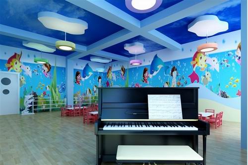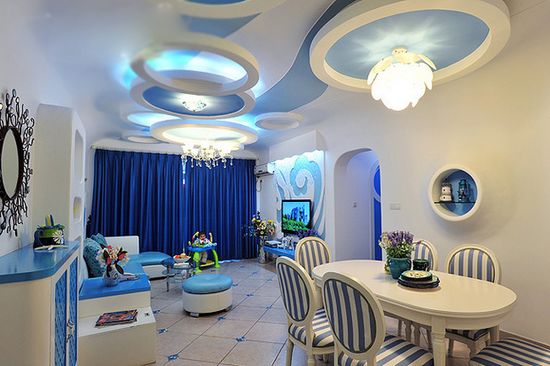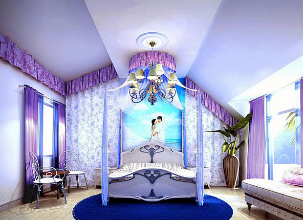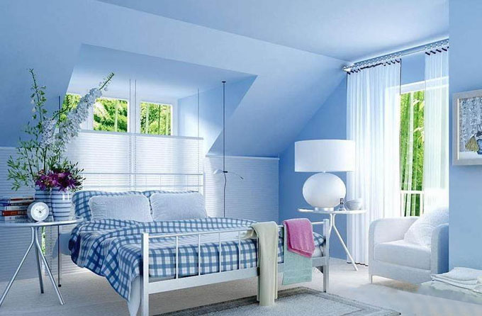 在冷色系中,藍色在視覺上具有縮小、退后的效果,如果利用得當,可以使房間看起來更大些。例如,在墻上掛上時鐘或裝飾畫,會使空間產生層次感,加上紫色緩和深藍色的沉重,帶來成熟感覺。鮮亮的色調和灰暗的色調恰當組合,會產生獨特效果。
