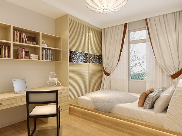 在對一個小面積臥室進行裝飾設計之前,既要考慮到它整體的美觀,也不能忽視它的實用性。臥室內實際需要的擺設并不是很多,所以不要在你的臥室里面放很多在辦公室也能看到的擺設,這樣會讓它看起來不倫不類。一張溫馨而舒適的床,一個隨你喜好的或松軟或稍硬的床墊,觸手可及的床頭柜,適合在睡前閱讀的燈光,儲放衣物的壁柜,以及門后為懸掛睡衣而用的衣鉤———以上這些就是一個臥室應有的必需品。有了一個這樣清晰的概念,我相信你的臥室不會比任何一間兼具著辦公室效用的大面積臥室遜色。