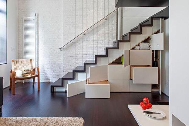 如果空間相對(duì)狹小,還可以考慮L型樓梯。它的踏板長(zhǎng)度在60cm左右。考慮到每個(gè)踏板只能單側(cè)受力,在選擇板材的時(shí)候,需要選擇比堅(jiān)固的。在小公寓房中,帶拐角的L型梯比較常見,可以節(jié)省非常多的空間。