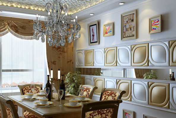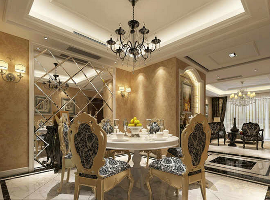 歐式餐廳的環境小,所以其背景墻比較適合歐式古典奢華風,可以選擇古典實木型的餐桌來搭配,然后燈光為黃色居多,營造西式的用餐浪漫。而現代歐式風格相對比較純潔,背景墻很多一金色、棕色等色澤,歐式古典油畫、壁畫都是必不可少,很多以鎏金的壁紙裝飾也是很不錯的效果。