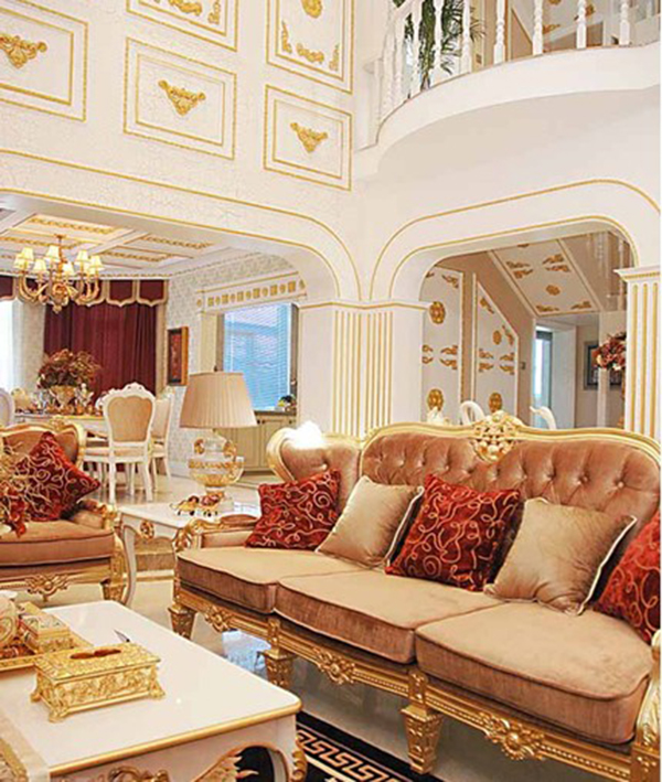 俄羅斯風格設計多以簡練的色彩和冷靜的基調為主,在強調理性冷靜的同時又加入少許的出奇的創意加以配置,用《這個殺手不太冷》這部電影來形容它的風格最適宜不過。總體特征是輕盈、華麗、精致、細膩。室內裝飾造型高聳纖細,不對稱,頻繁地使用形態方向多變的如“C”“S”或渦券形曲線、弧線,并常用大鏡面作裝飾,大量運用花環、花束、弓箭及貝殼圖案紋樣。善用金色和象牙白,色彩明快、柔和、清淡卻豪華富麗。室內裝修造型優雅,制作工藝、結構、線條具有婉轉、柔和等特點,以創造輕松、明朗、親切的空間環境。
