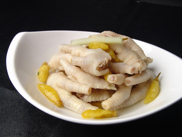3、鳳爪洗凈,用水煮斷生(各地風(fēng)味不同,綿竹清道做法則是將雞爪煮致較軟,去骨,切忌不可煮太久以致成綿軟過(guò)爛),煮好后撈出,用清水洗去浮末,切成兩塊到三塊,晾干;